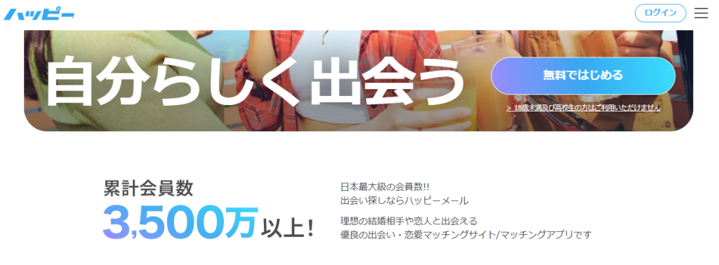 ![]() ハッピーメール | とにかく母数を増やしたい人 累計3,500万人の圧倒的数 人妻の多さ 母数で勝負 / 無料特典 1,200円分 |
